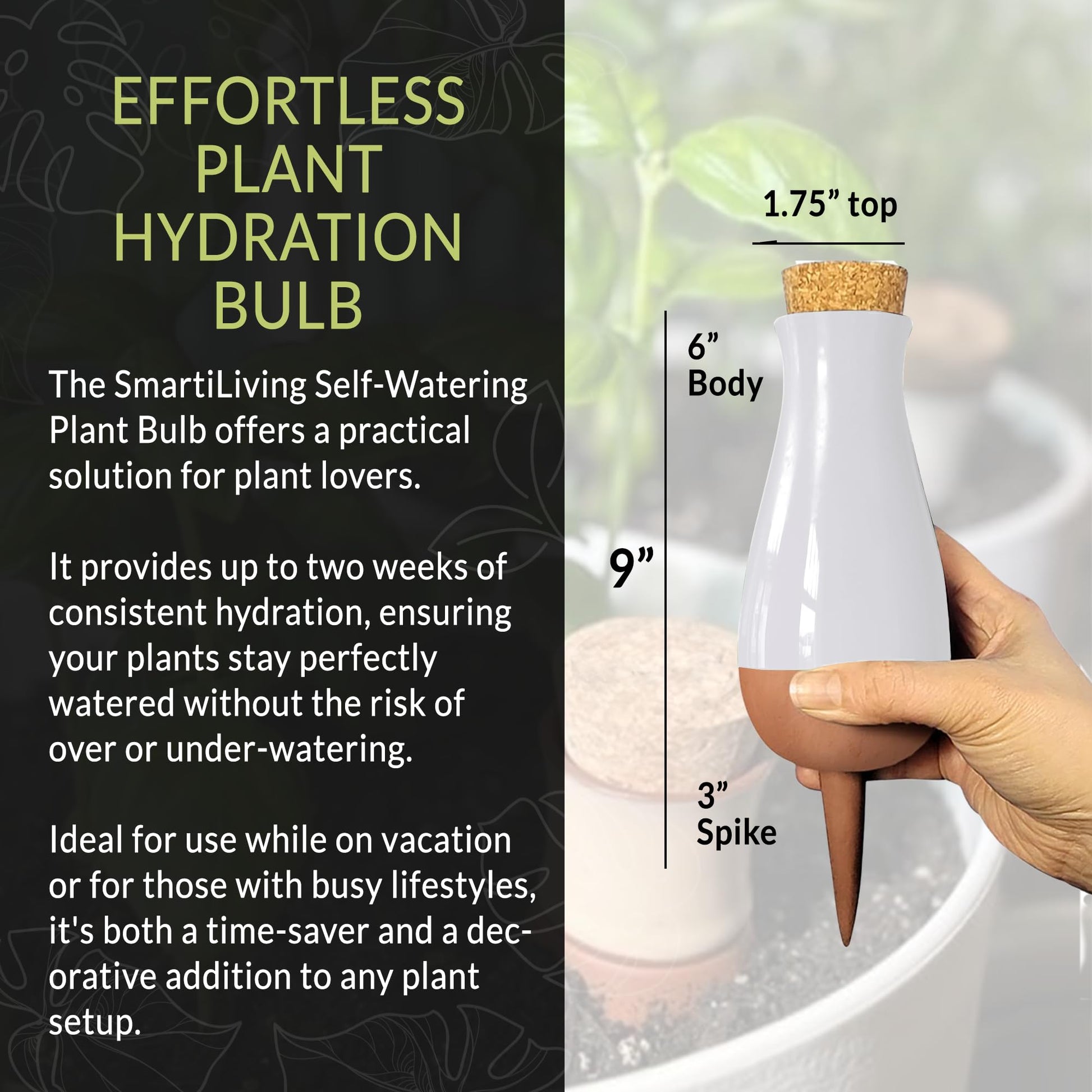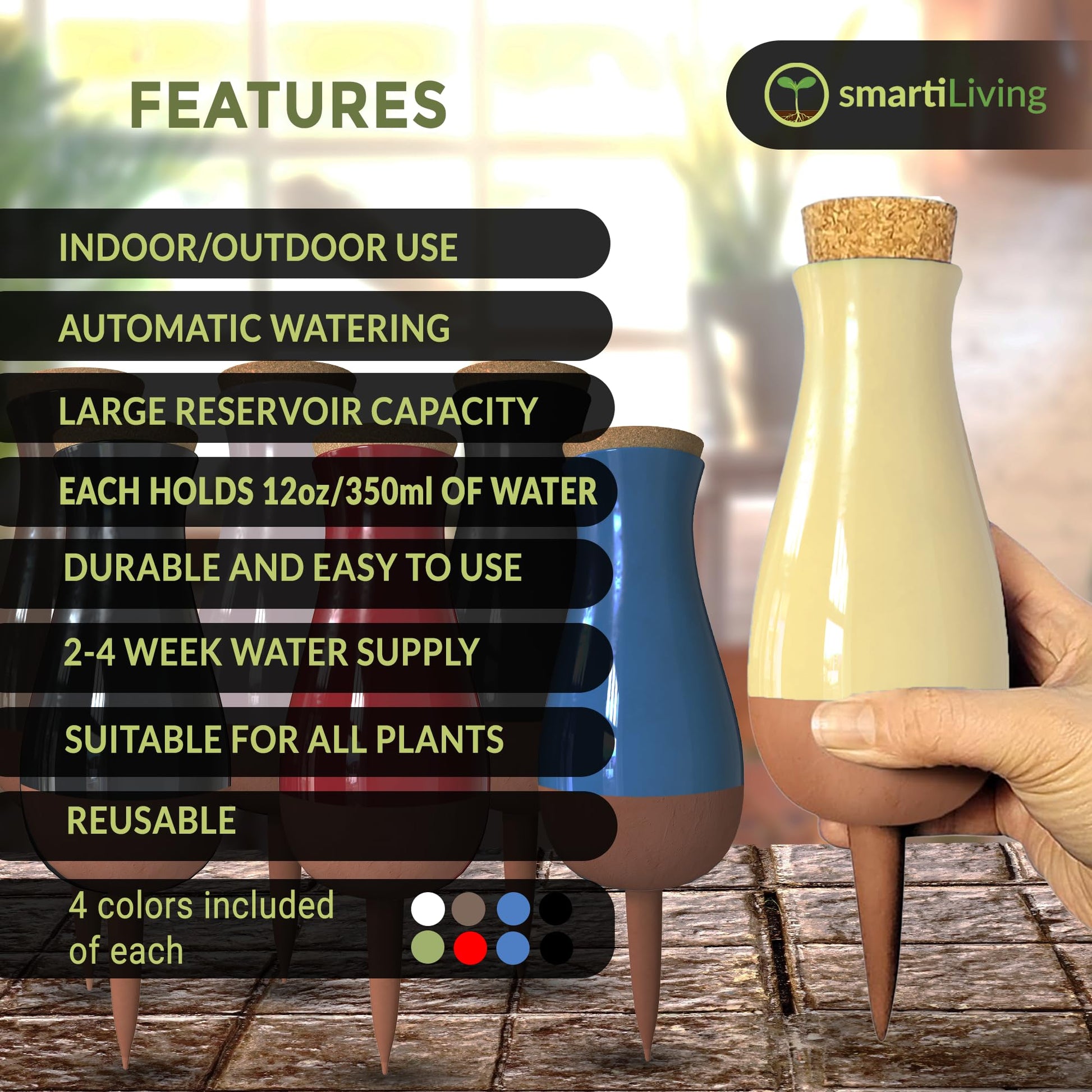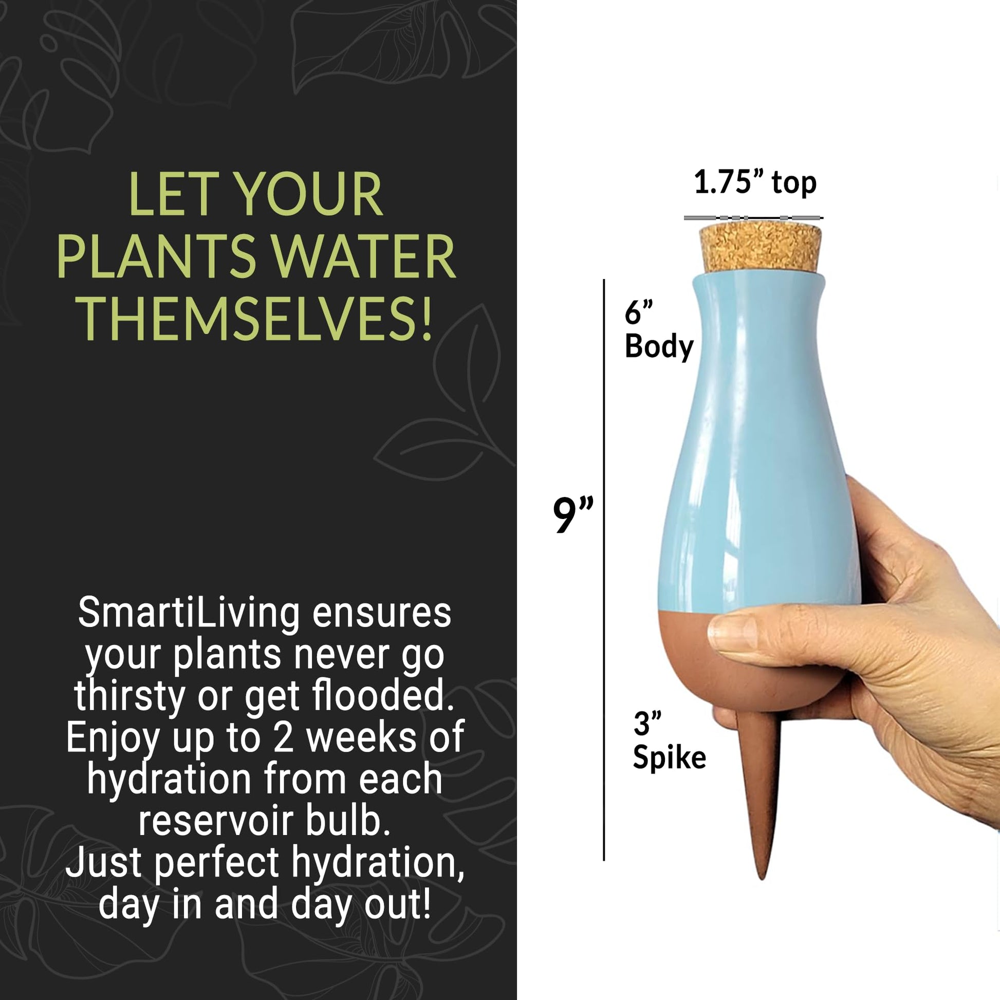 Make taking care of your plants easy and fun with our colorful SmartiLiving Drip Irrigation Stakes Bundle. This set comes with terracotta feeders in cool colors like black, red, blue, yellow, white, and pink. They help give your plants just the right amount of water every day, so they grow big and strong without any trouble. Our special design means you don't have to water your plants all the time. Just fill up the big bulb, and your plants will get the perfect amount of water for up to 4 weeks. Plus, these watering stakes look great and fit right in with your plants. They're super easy to use, just stick them in the soil, fill them with water, and you're all set. This makes it perfect for anyone who loves plants, whether you have them inside, outside, or on a balcony. With our watering spikes, your plants will always be happy and hydrated, even if you're not around.